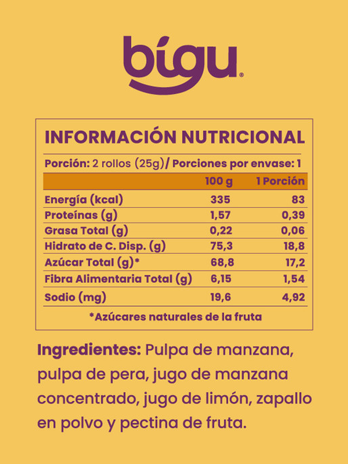 Cada unidad incluye 2 deliciosos rollos de fruta y vegetales deshidratados, equivalentes a 25 g. Sin azúcar añadida, libres de gluten, alérgenos y aptos para veganos, estos rollos son 100% naturales, elaborados exclusivamente con frutas y verduras.